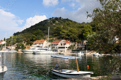 croatia, mediterranean, sea, fishing, boat, nautical, vessel, small, port, harbor, dock, pier, bay, water, summer, landscape, island, dalmatia, europa, adriatic, sailing, sailboat, house, architecture, building, hill, tree, wood, forest, sky, cloud, cloudscape, seascape, coast, shore, promenade, view, village, rural, rustic, travel, tour tourism, vacation, holiday, destination, location, scenic, town