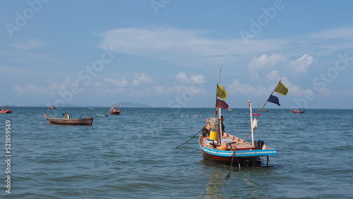 small fishing boat low tide, small boat out to sea with colored flags attached in the sea in Thailand.