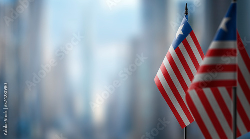 Small flags of the Liberia on an abstract blurry background