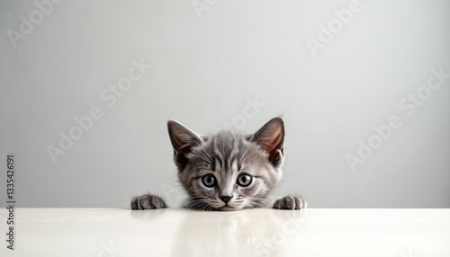 Small frightened grey tabby kitten peeks out from behind white table with copy space. Drooping ears, curious eyes. Adorable silver cat face, paws. Banner background. Pet care, veterinary concept.