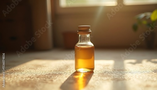 Small glass bottle with amber liquid casting long shadow on carpet under natural window light