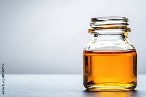 Small Glass Jar Filled with Golden Liquid Oil on a Simple Gray Background for Culinary and Natural Health Uses