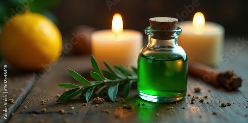 Small glass vial containing a murky green liquid surrounded by candles and dried herbs, elixir, occult