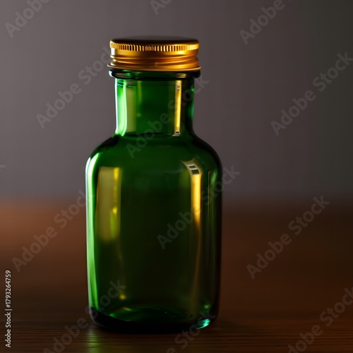 Small green glass bottle with gold cap on wooden surface