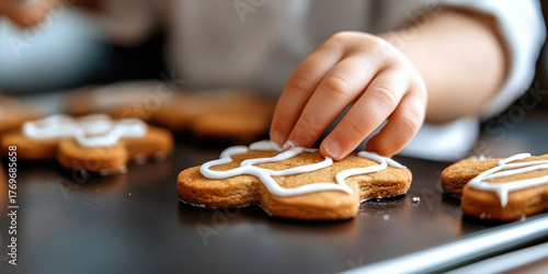 Small hands piping white icing onto gingerbread cookies, spreading holiday cheer with seasonal baking preparation