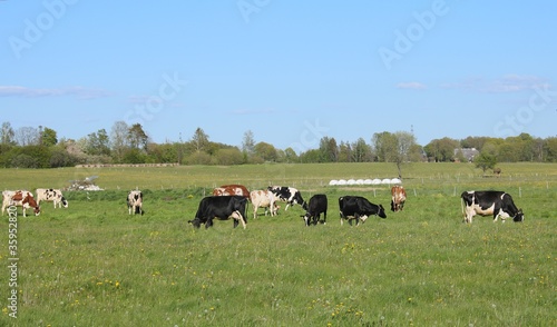 Small herd of domestic cows graze in a green meadow behind a beast