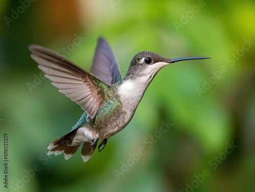 hummingbird, bird, avian, nature, wildlife, flying, flight, aerial, swift, fast, hovering, beauty, vibrant, green, body, white, head, feather, wing, beak, slender, long, delicate, graceful, garden, park, setting, background, blurred, soft, sharpened, closeup, macro, photo, environment, ecosystem, conservation, habitat, biodiversity, species, ornithology, feathered, winged, behaviour