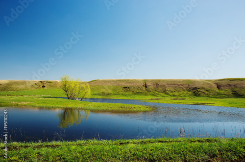 small lake with one tree on the background of blue sky and green fields.