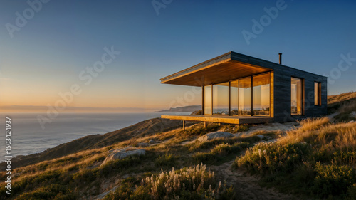 cabin, modern architecture, ocean view, sunset, landscape, nature, minimalism, prefab, get-away, retreat, calmness, peace, serenity, relaxation, escape, travel, adventure, exploration, wanderlust, outdoors, scenic, picturesque, beautiful, stunning, breathtaking, golden hour, dusk, twilight, coastline, sea, coast, hilltop, mountain, vale, remote, secluded, solitude, privacy, sustainable, design