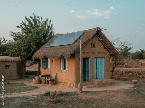 Small mud brick home with solar panels set in a rural village landscape surrounded by nature and simpler living