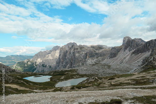 Small, navy blue lakes at the bottom of the valley in Italian Alps. The lakes are surrounded by high and steep peaks. The slopes are lush green. The sky is full of soft clouds. Raw landscape. Remedy