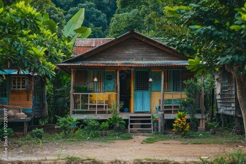 small old wooden country house view in summer. Stone pathway, green lawn, conifers and shrubs.