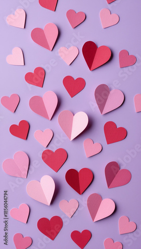 Small paper hearts scattered on a pastel lavender background. Flat lay composition with soft pink and muted red paper hearts, even studio lighting, clean minimal surface, and clear copy space.