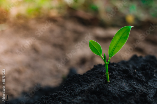 small plant growing on dirt in nature with sunshine green background. environment concept