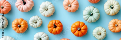 Small pumpkins in vibrant shades of orange, white, and pink are arranged neatly on a light blue surface, showcasing their charming appeal for seasonal decorations