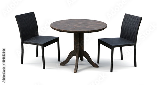 table, chair, wood, furniture, round, black, brown, modern, design, patio, garden, dining, set, interior, decor, wood grain, woven, lifestyle, home decor, living room, isolated, copy space, product, display, commercial, image, photo, studio, simple, minimalist, dark, compact, wooden, dark brown