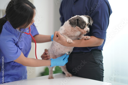 Small Shih Tzu dog, veterinarian working in hospital The veterinarian is examining the dog to see what disease it has. A young dog is being examined at the clinic.