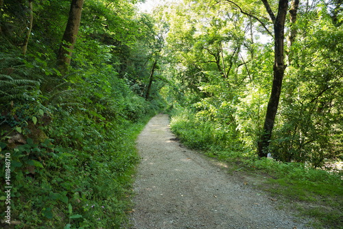 Small stone path surrounded by a lush green forest, ideal for walking and hiking in nature. Concept road, path, trail, mountain, nature.