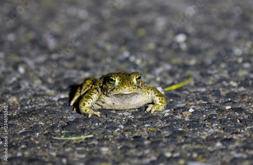 small toad on the road, small toad with warts on the body, green eyes of a frog, frog with warts, Bufonidae from the front