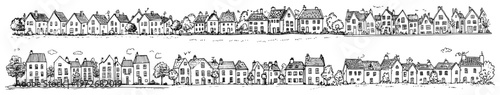 house, town, street, village, architecture, row, building, city, urban, residential, european, home, facades, panorama, scenery, vignetting, drawing, ink, doodle, hand-drawn, linear, minimalist, set, collection