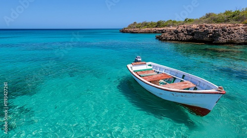 boat, water, ocean, sea, beach, sky, sun, summer, clear, turquoise, blue, calm, tranquil, peaceful, serene, coast, shore, rocky, island, tropical, vacation, travel, holiday, paradise, relax, escape, idylli, scenic, beautiful, nature, landscape, view, day, bright, sunlight, horizon, shallow, wave, reef, sand, sunshine