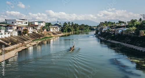 Small wooden banca boat navigating residential river canal under blue sky In Santa Cruz, Laguna Philippines