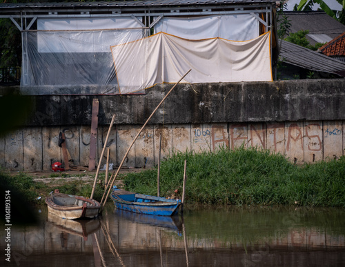 Small wooden boats floating on the brown water river. Beautiful landscape background at Cisadane River, Tangerang, Banten, Indonesia