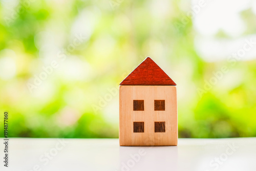 Small wooden house model on white table with green nature bokeh background. Real estate investment, eco friendly home, property mortgage, and residential loan concept for sustainable living.