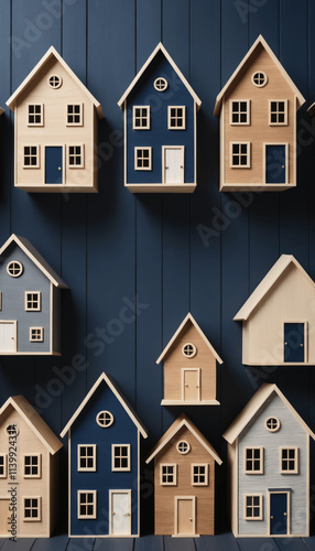 Small wooden houses representing the real estate concept against a wooden background