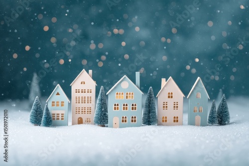 Small wooden houses surrounded by snow-covered trees in a serene winter landscape.