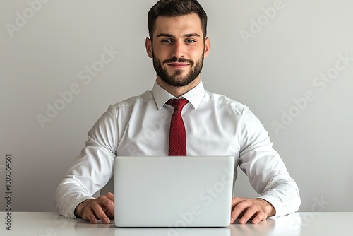 Smart business men wearing a red tie, sitting behind a laptop on a white desk