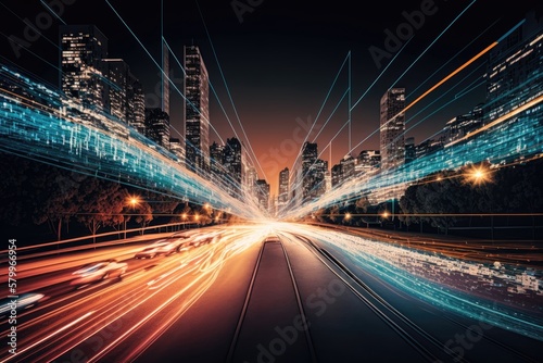 light, trail, smart, city, technology, futuristic, speed, connection, concept, communication, night, traffic, urban, business, transportation, motion, illuminated, innovation, cyberspace, road, network, digital, background, fast, future, highway, movement, skyscraper, information, online, vehicle, dynamic, effect, generative, ai