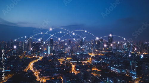 Smart digital Innovation city with connection network reciprocity over the cityscape. of future smart wireless city and social media networking systems that connects business people with in city