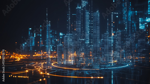 Smart digital Innovation city with connection network reciprocity over the cityscape. of future smart wireless digital city and social media networking systems that connects people with in city