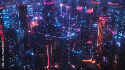 Smart digital Innovation city with connection network reciprocity over the cityscape. of future smart wireless digital city and social media networking systems that connects people with in city