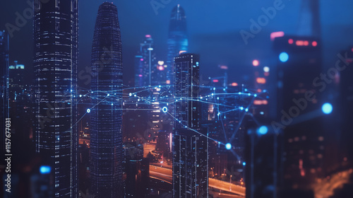 Smart digital Innovation city with connection network reciprocity over the cityscape. of future smart wireless digital city and social media networking systems that connects people with in city
