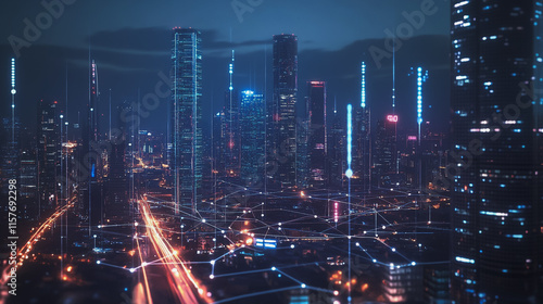 Smart digital Innovation city with connection network reciprocity over the cityscape. of future smart wireless digital city and social media networking systems that connects people with in city