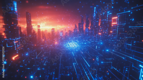 Smart digital Innovation city with connection network reciprocity over the cityscape. of future smart wireless digital city and social media networking systems that connects people with in city