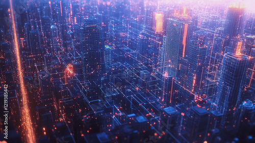 Smart digital Innovation city with connection network reciprocity over the twilight cityscape. of future smart wireless digital city and social media networking systems that connects people with city
