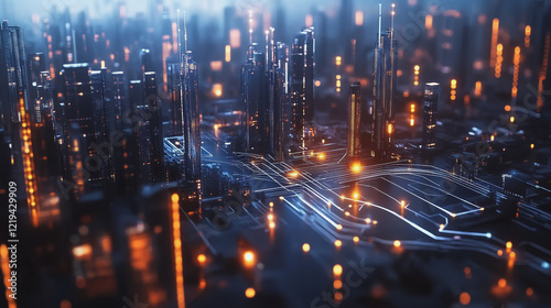 Smart digital Innovation city with connection network reciprocity over the twilight cityscape. of future smart wireless digital city and social media networking systems that connects people with city
