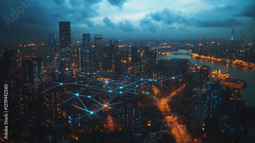 Smart digital Innovation city with connection network reciprocity over the twilight cityscape. of future smart wireless digital city and social media networking systems that connects people with city