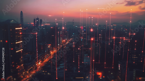 Smart digital Innovation city with connection network reciprocity over the twilight cityscape. of future smart wireless digital city and social media networking systems that connects people with city
