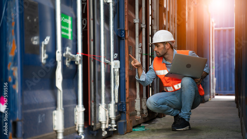 Smart Engineer or supervisor checking and control loading Containers box from Cargo at harbor.Foreman control Industrial Container Cargo freight ship at industry.Transportation and logistic concept.