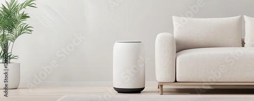 Smart home minimalist idea. Modern living room featuring a stylish white sofa and a sleek air purifier.