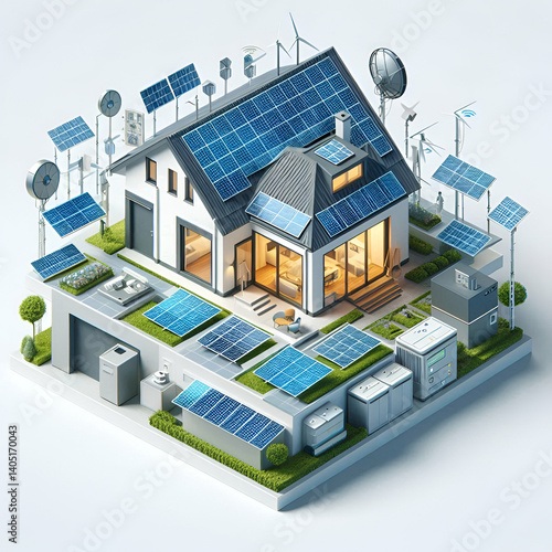 Smart home with solar panels and battery storage concept as A vector graphic showing a modern smart home equipped with rooftop solar panels and battery storage units isolated on a white background. in