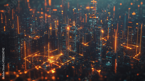 Smart Innovation city with connection cyber security network reciprocity over the night cityscape future wireless digital city and social media networking systems that connects people in the city