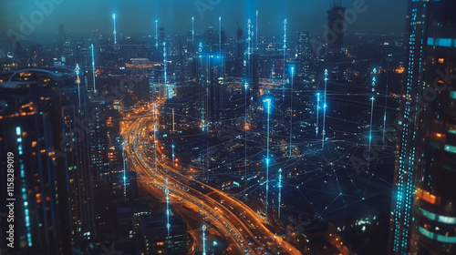 Smart Innovation city with connection cyber security network reciprocity over the night cityscape future wireless digital city and social media networking systems that connects people in the city
