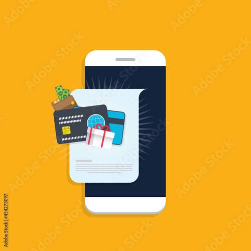 Smart phone notification with gift box, money, present and cash. Online award or bonus achievement as giveaway.
