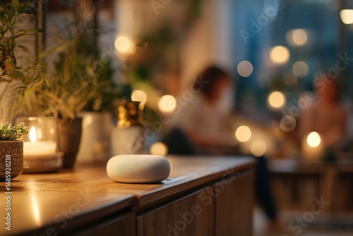 Smart Speaker im Wohnzimmer, Kerzenlicht, gemütliche Stimmung