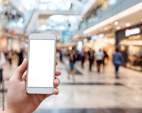 smartphone, hand, shopping, mall, people, crowd, blurred, background, interior, white, blank, screen, display, modern, technology, retail, commerce, hand-held, digital, image, sharpened, outdoors, indoor, urban, public, architecture, business, light, colours, blur, perspective, detail, empty, device, communication, picture, photo, graphic, marketing, blurry